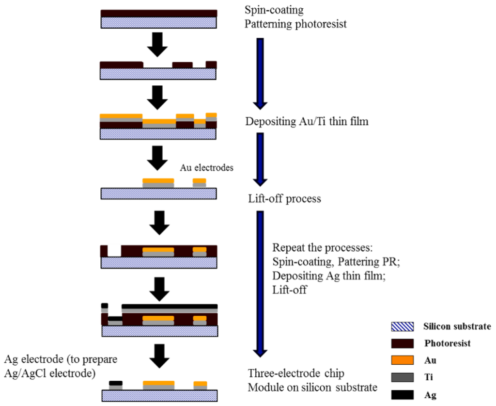 The first step in fabricating the three-electrode layer from the MEMS process involved spin-coating the AZ1500 photoresist with a thickness of 1.5 ctrode layer from the MEMS proces3N4), and then setting the pattern with a Mask Aligner (MA 150CC, SUSS Micro-Tec, Garching, Germany). Then, a Ti (15 nm) layer was deposited to enhance the adhesion of Au to the silicon surface, after which e-beam evaporation was used to deposit the Au layer (120 nm). The pattern on the Au layer was then created by a standard lift-off process. In this manner, both the Au electrodes namely the working and counter electrodes were fabricated. Also the fabrication of the Ag electrode (120 nm) followed the above-mentioned process. The metal-deposition conditions are summarized in Table 1, with each layer deposited in two steps. The metal-deposition rate of the first step was 10 times slower than that of the second step. However, the two-step metal-deposition procedure was used because it gave superior adhesion and film quality. After finishing the micro-fabrication of the three electrodes, the Ag electrode was oxidized in a FeCl3 (100 mM) solution to produce the Ag/AgCl reference electrode. Finally, the fabrication process was completed by washing the three electrodes in distilled water. A flow chart of the entire process is shown in Figure 2.