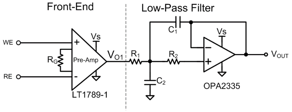 Figure 4 schematically depicts the proposed readout circuit, which includes two parts: The front-end amplifier and low-pass filter. The front-end amplifier of the readout circuit must possess the following characteristics: a high common mode rejection ratio (CMRR), high input impedance, low-power consumption, and low noise for processing the bioelectrochemical signals. Therefore, a high-performance instrumentation amplifier (LT1789-1, Linear Technology, Milpitas, CA, USA) was adopted as the front-end readout circuit of the system. The utilized amplifier had a CMRR of 100 dB and a power supply rejection ratio (PSRR) of 100 dB. The WE and RE were connected to the differential inputs of the instrumentation amplifier, with RG used to tune the gain for the readout potential change of the urea concentration. Accordingly, the gain of LT1789-1 can be represented as: