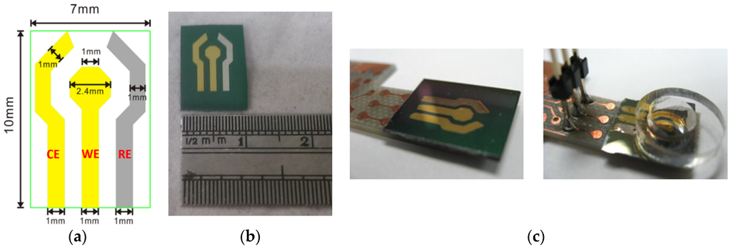 A three-electrode system functioning as a urea sensor, as well as a system for detecting urea concentration, was fabricated by a MEMS technique. A schematic diagram of the fabricated three microelectrode urea sensor prototype is shown in Figure 5a. As can be seen, the diameter of the sensing area is 2.4 mm, while those of the counter and reference electrodes are both 1.0 mm. The total area of the urea sensor is 70 mm2, with an actual sensing area of 4.78 mm2 on the working electrode. Additionally, polydimethylsiloxane (PDMS) was used to create a reservoir for the urea samples. Detection of the urea concentration was carried out once the urease enzyme was immobilized on the Au working electrode via the formation of a film of copolymer poly(ANI-co-o-PD), i.e., poly(aniline-co-o-phenylenediamine) (i.e., A photograph of the fabricated three-electrode electropolymerization urea sensing chip is presented in Figure 5b, with the proposed sensor integrated with the IC heterogeneously. Therefore, the proposed sensor was attached to a printed circuit board (PCB) and the reservoir channel holding the working electrode was made by PDMS, as shown in Figure 5c.