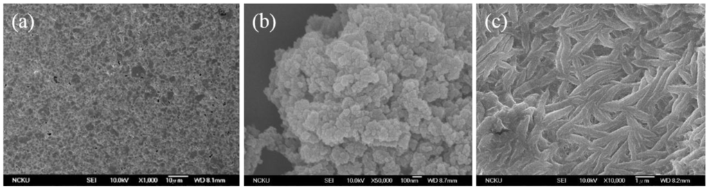 SEM images of the sensing surface of (a) Au; (b) polyaniline electro-fabricated onto Au; and (c) poly (aniline-co-o-phenylenediamine) on Au.