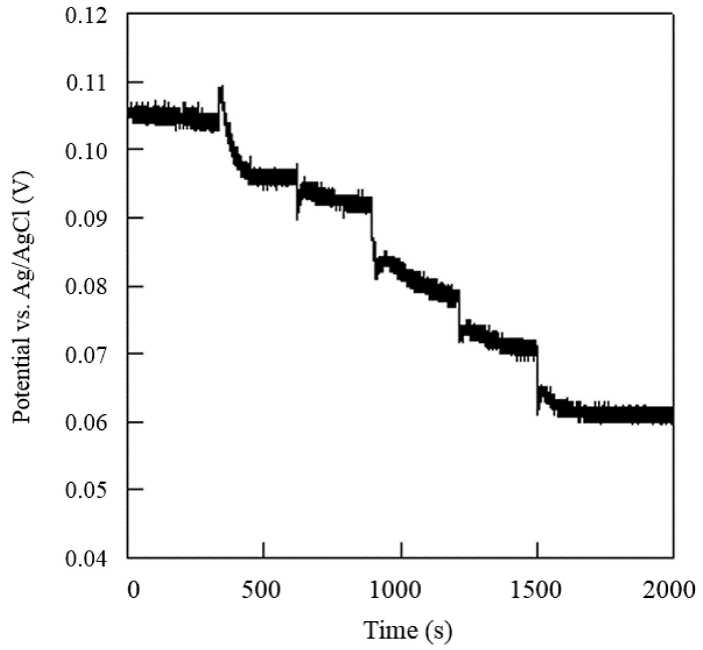 In this paper, electrochemical analysis experiments were conducted with the proposed system device and urea electrochemical sensor. The urea concentration measurement was performed by the sequential injection of urea up to a working volume of 50 μL. The urea concentration of the proposed system device was calibrated by using a commercial potentiostat (CHI-611C, CH Instruments Inc., Tennison Hill Drive Austin, TX, USA) as the standard. Figure 9 shows the time profile of the corresponding voltage changes in response to the sequential injections of urea. Figure 10 shows the potential variations against the urea concentrations obtained. The minimum urea concentration required that could be detected was experimentally found to be 3.16 × 10−4 M (1.89 mg/dL) with the pH set at 7.4. Furthermore, a sensitivity of 31.12 mV/log [M] could be achieved in the urea concentration range of 3.16 × 10−4 M to 3.16 × 10−2 M (1.89–189.93 mg/dL) with a precision of 0.995 (R2 = 0.995). With a sample volume of only 10 μL, accurate measurement of the urea concentration could be obtained in less than 100 s.