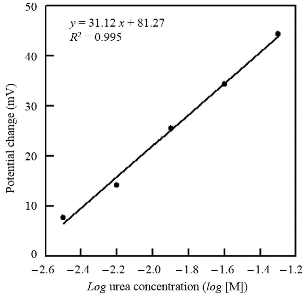 The urea concentration in human blood, called blood urea nitrogen (BUN), is significant for the assessment of normal renal function. BUN, a metabolic waste product of protein, is secreted by the kidneys and excreted from the body via urine. The BUN of a healthy adult ranges between 6 and 21 mg/dL (1–3.5 mM). Renal failure and related complications, such as acute or chronic urinary tract obstruction, hepatic failure and nephritic syndrome, could causes in urea concentration [1,2,3,4]. Currently, more than two thousand people per million worldwide rely on hemodialysis. Normally, hemodialysis is required when the urea concentration in serum is above 180 mg/dL. BUN is temporarily raised in some diseases or human conditions such as liver dysfunction, upper gastro-intestinal bleeding, hydropenia, or hepatitis. Thus, it is essential to develop a device that can measure urea concentration rapidly and precisely.