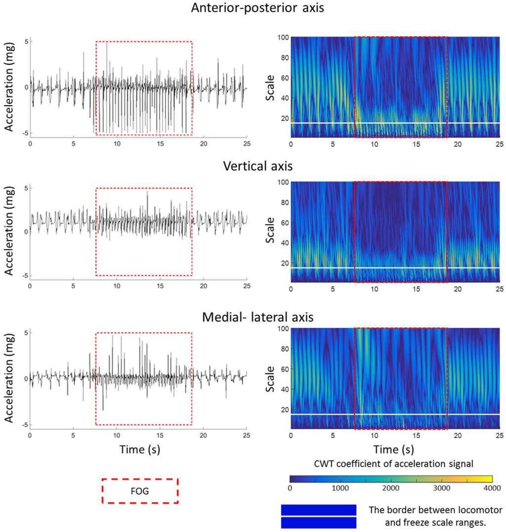 Previous studies [15,16] used Fourier transform to elicit information from the frequency domain of acceleration data in order to detect the FOG episodes. In this study, we applied CWT on acceleration data to extract further features. CWT method provides the information not only in frequency domain but also in temporal domain that may help in defining a better FOG index using an appropriate window size and update rate.