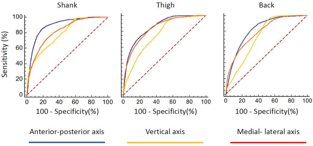 Receiver operating characteristic (ROC) curves for all sensors and all the three axes.