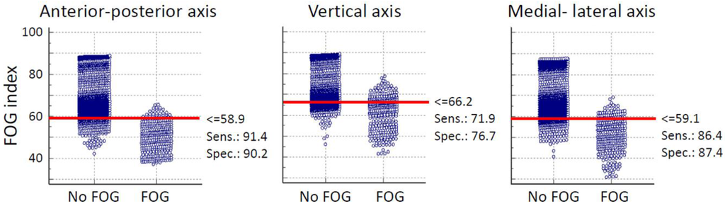 The threshold which discriminated FOG from the other activates was defined from the average data of all subjects based on the results of interactive dot diagram. The interactive dot diagram of FOG index for shank senor of subject 2 is illustrated in Figure 3. The horizontal line in each graph shows the best threshold which could discriminate FOG from other activities. In Figure 3, each circle shows the value of the proposed FOG index which are classified in two groups based on our ground truth clinical assessments. So, all circles in the “FOG” group indicate true FOG events and those in the “No FOG” group are true no FOG events (other movements). The overlap between the two sections indicate the false negative (circles located above threshold line in “FOG” group) and false positive (circles located below threshold line in “No FOG” group) of the proposed index.
