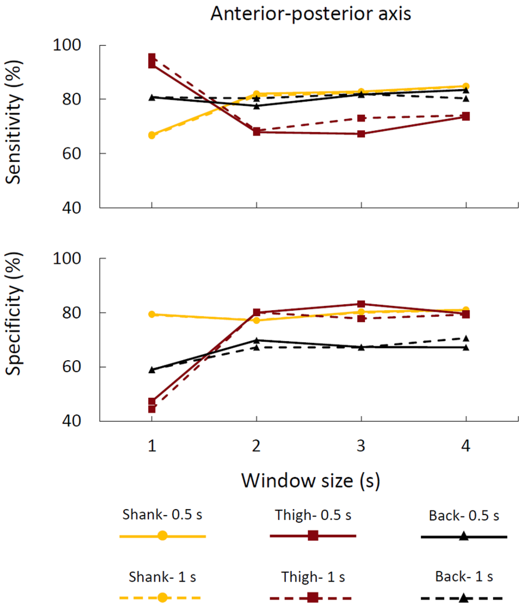 In order to verify the appropriate window size and update times, we applied the FOG detection method on various window sizes that were smaller than 4 s (3, 2 or 1 s) on the anterior–posterior acceleration of the different sensor placements. We also employed larger update time (1 s) to examine the case in which the access to the processor could be limited and fast calculation was not available which would require the larger update time. The averages of sensitivity and specificity of various window sizes, update times, and sensor placements were presented in Figure 4.