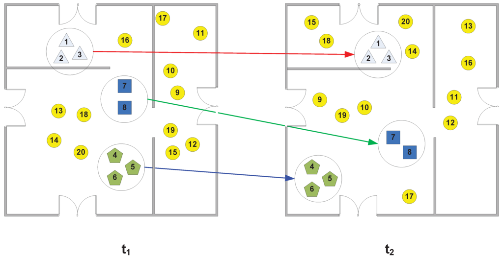 An illustration of mobile group consumption. Several people wander around a shopping mall with different regions. Each person is denoted by a node, and those belonging to groups have the same shape, except for the circle. The circle nodes denote the people who do not belong to groups (i.e., individuals). The picture on the left is a snapshot of people at timestamp , and the picture on the right is a snapshot of people at timestamp after .
