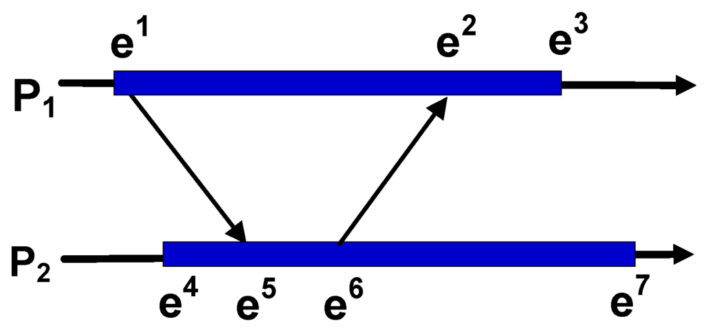 Let us define the temporal relations under asynchronous communications more formally. Suppose that there are n devices () and that each device records its alternate states and events [9], where denotes the k-th state and denotes the k-th event that changes the local state from to , at the device .