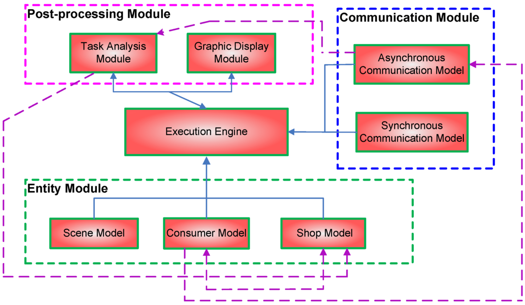 It is noted that some models may affect each other. These influences are indicated using dashed lines in Figure 3. Consumers’ motions may affect the promotion strategy of a shop, and the promotion strategy of a shop may also affect consumers’ motions. Therefore, there are bidirectional dashed lines between the consumer model and the shop model. The shop model may also be affected by the results of the task analysis module. In the case of the asynchronous communication model, the parameters of message passing may be affected by consumers’ motions, on the one hand, and affect the results of the task analysis module, on the other. The impact of different models is left for future work and is not implemented in the current system.