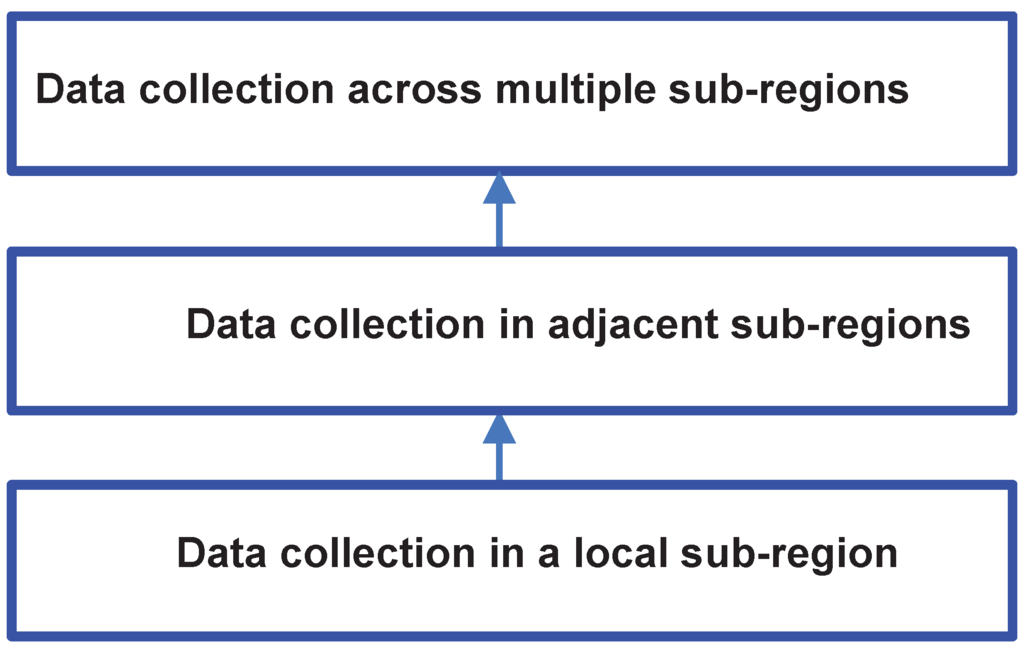 We propose a three-layer solution for distributed data collection of mobile group consumption. The whole target region is split into several sub-regions. As shown in Figure 4, the first layer processes data collection in a sub-region; the second layer processes that in adjacent sub-regions; and the third layer processes that across multiple sub-regions or even across the entire region. Most of the data collection requirements can be processed locally in the first layer. However, local processing is not necessarily optimal or correct. For example, users may need to collect data in a 10-m area centered at A. Local processing is acceptable when A is located within a sub-region, because the considered area is included in the sub-region, whereas it may be incorrect when A is near the boundaries of a sub-region, because the considered area may span two or more adjacent sub-regions. The second layer can be used to coordinate data from adjacent regions. Other data collection requirements that involve multiple sub-regions can be coordinated in the third layer.