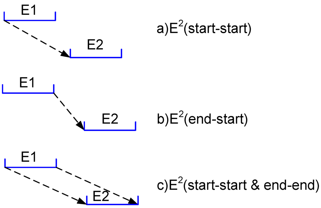 In a classical system with synchronized clocks, a causality relation can be detected based on the value of the clocks directly, whereas in an asynchronous distributed system, such clocks are not available. Therefore, we need to utilize message passing to detect the causality relation, which can be based on different definitions. We describe the most common ones in Figure 5. In the first case, the causality is based on the start time of the first gathering event and the start time of the second gathering event. We refer to it as , where 2 refers to the two events considered and start-start refers to the delimitation time of two gathering events. In the second case, the causality is based on the end time of the first gathering event and the start time of the second gathering event. We refer to it as . In the third case, the situation is more complex. The causality is based on the fact that the start time of the first gathering event happens before the start time of the second gathering event, and the end time of the first gathering event happens before the end time of the second gathering event. We refer to it as . The dashed lines in Figure 5 denote the message passing between the two events, hence their “happen before” relation. Our algorithm can support these three definitions.