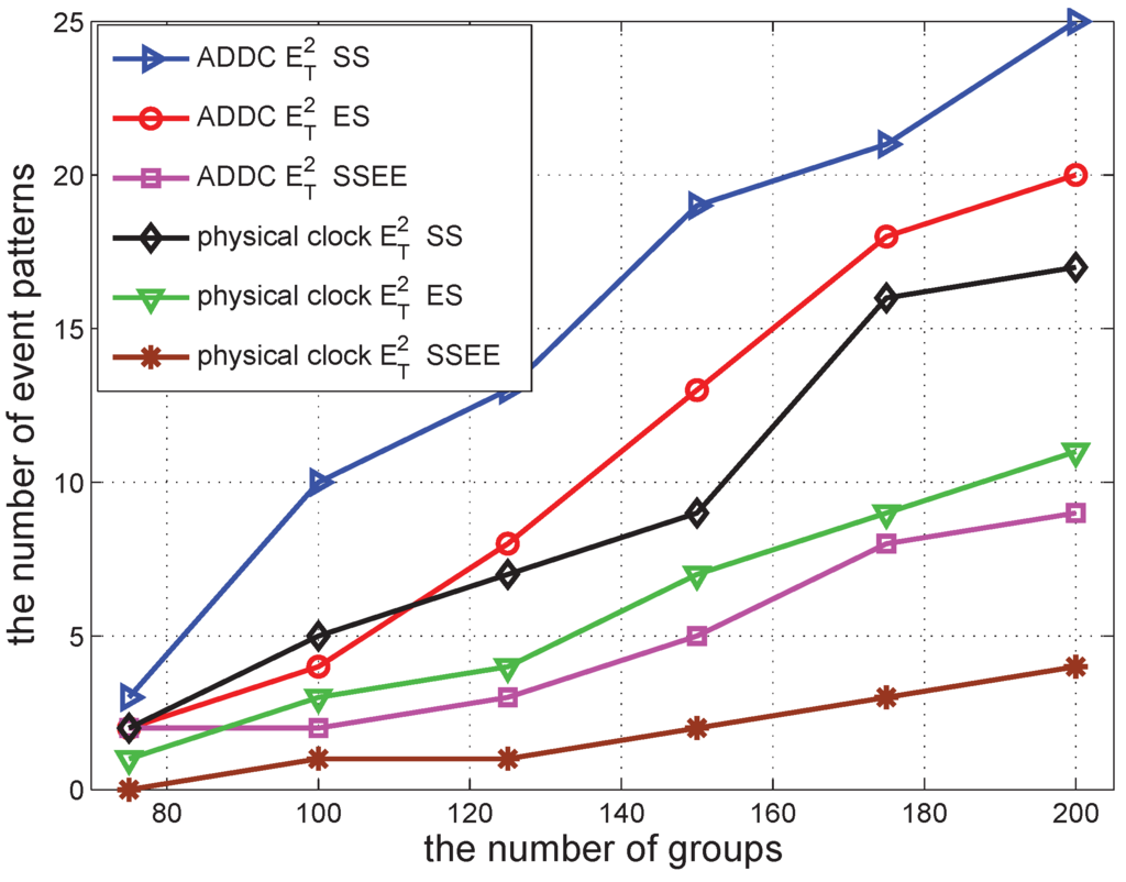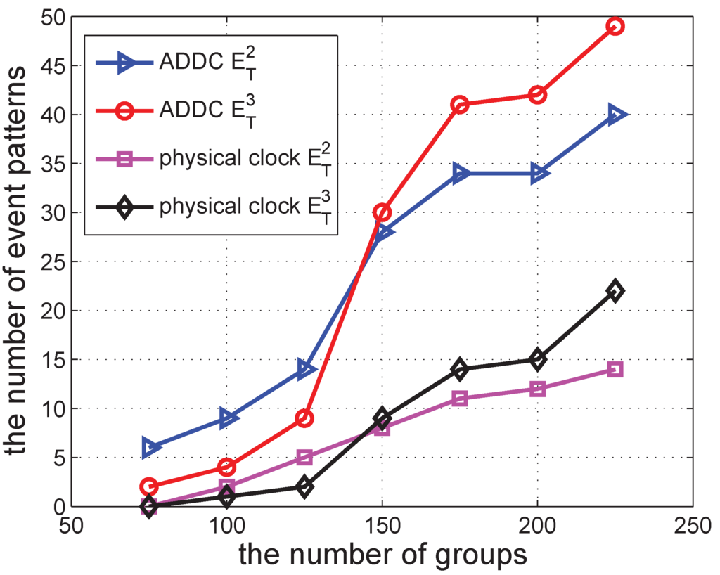 We then fix the number of groups at 150 and change Tto check the result. The result can be seen in Figure 11. The number of event patterns detected by ADDC under all of the definitions is constant. This is in line with the fact that ADDC is based on message passing rather than on the physical clock; hence, the results are not related to T. The number of of event patterns detected under the physical clock increases when Tincreases. This is because a larger value of T relaxes the constraints of a causality relation. When T increases, the gap between the values obtained by ADDC and the physical clock is reduced, because the constraint is relaxed. The difference between the event patterns detected by and those detected by is stable under ADDC or physical time. This also holds for other definitions of causality relations.