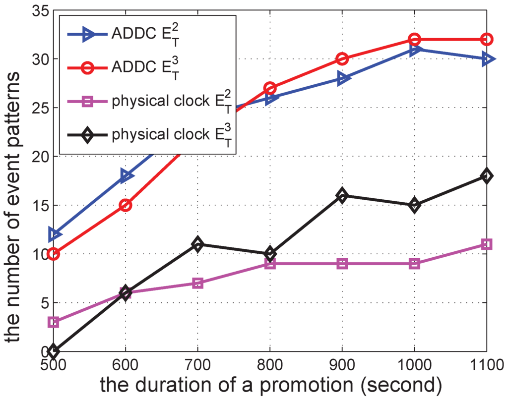 We then change the duration of a promotion from 500 to 1100 s, and the result is shown in Figure 7. The number of and detected by ADDC is quite similar in this case, since we only use the start time of each event to determine the “happen before” relation; such a relation is not sensitive to the duration of promotion activities. In contrast, the results obtained under the physical clock are more related to the duration of the promotion activity with regard to , which is determined by the end time of the first event to the start time of the following event. The results of ADDC are larger than those under the physical clock, since its constraint is less strict.