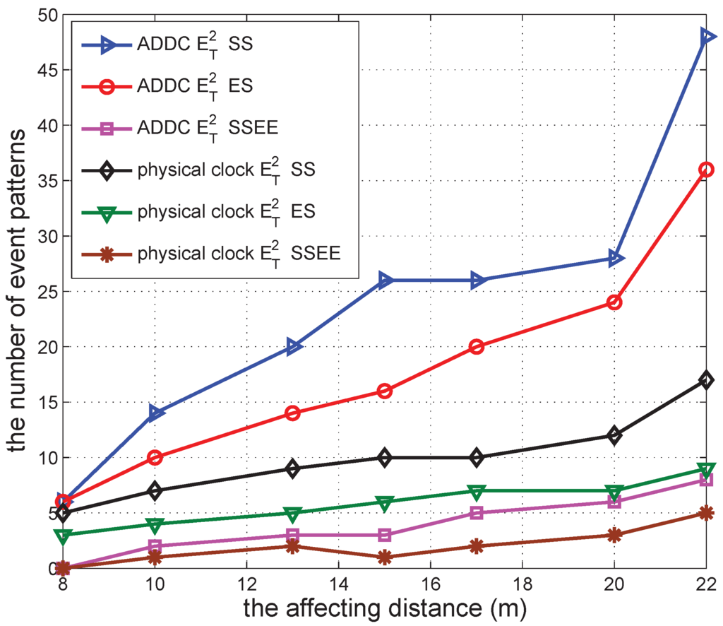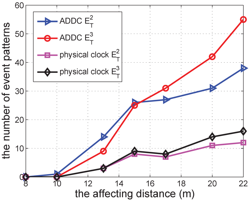 After that, we further check the result for different affecting distances. The result can be seen in Figure 12. According to the figure, the number of event patterns detected by both ADDC and under the physical clock increases when the affecting distance increases. This is because a larger affecting distance enables more consumers to receive promotion information and to engage in more gathering events. The number of event patterns detected by ADDC is larger than that under the physical clock using the same definition of the causality relation. The differences among definitions of causality relations are similar to those of previous results. The number of event patterns based on has the largest value, whereas that based on has the smallest value.
