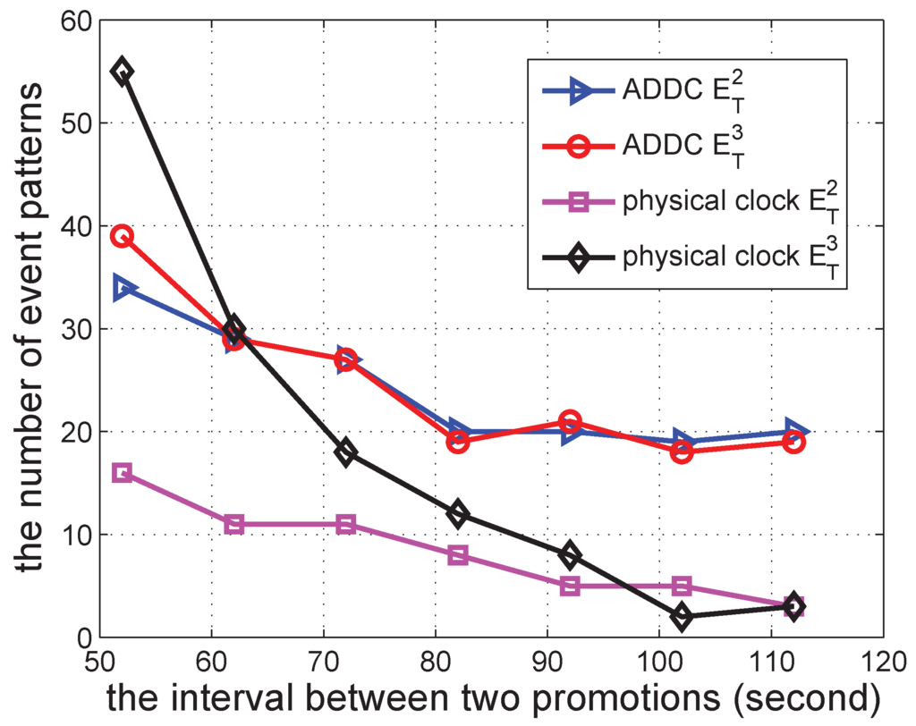 Finally, as shown in Figure 9, we change the interval between two promotions to check the number of event patterns. It can be seen that when this interval increases, the number of event patterns detected by both ADDC and the physical clock decreases. This is because the increased interval reduces the number of gathering events; hence, the number of event patterns decreases. The number of event patterns detected by ADDC is larger than that detected by the physical clock, which is consistent with previous results.
