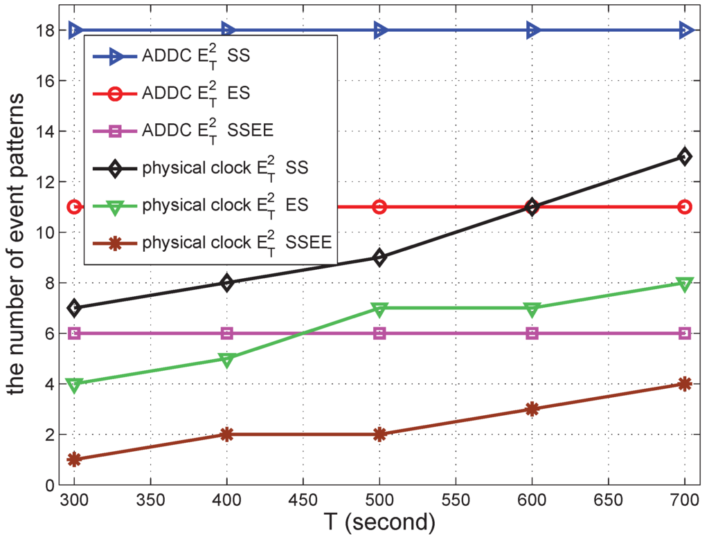We conducted simulations to validate the effectiveness of our proposed ADDC approach by comparing the results obtained with ADDC with those measured using the physical clock. The detection of causality relations among two/three gathering events is used as the comparison example. The number of event patterns satisfying the causality relation among two and three gathering events is denoted by and , respectively. For detection under the physical clock, we specify the duration between two gathering events T to be 500 s. For detection using ADDC, we need two gathering events to have the “happen before” relation (T is of no use in this detection). The time duration of is measured from the start time of the first gathering event to the start time of the second gathering event, and that of is measured from the end time of the first gathering event to the start time of the second gathering event.