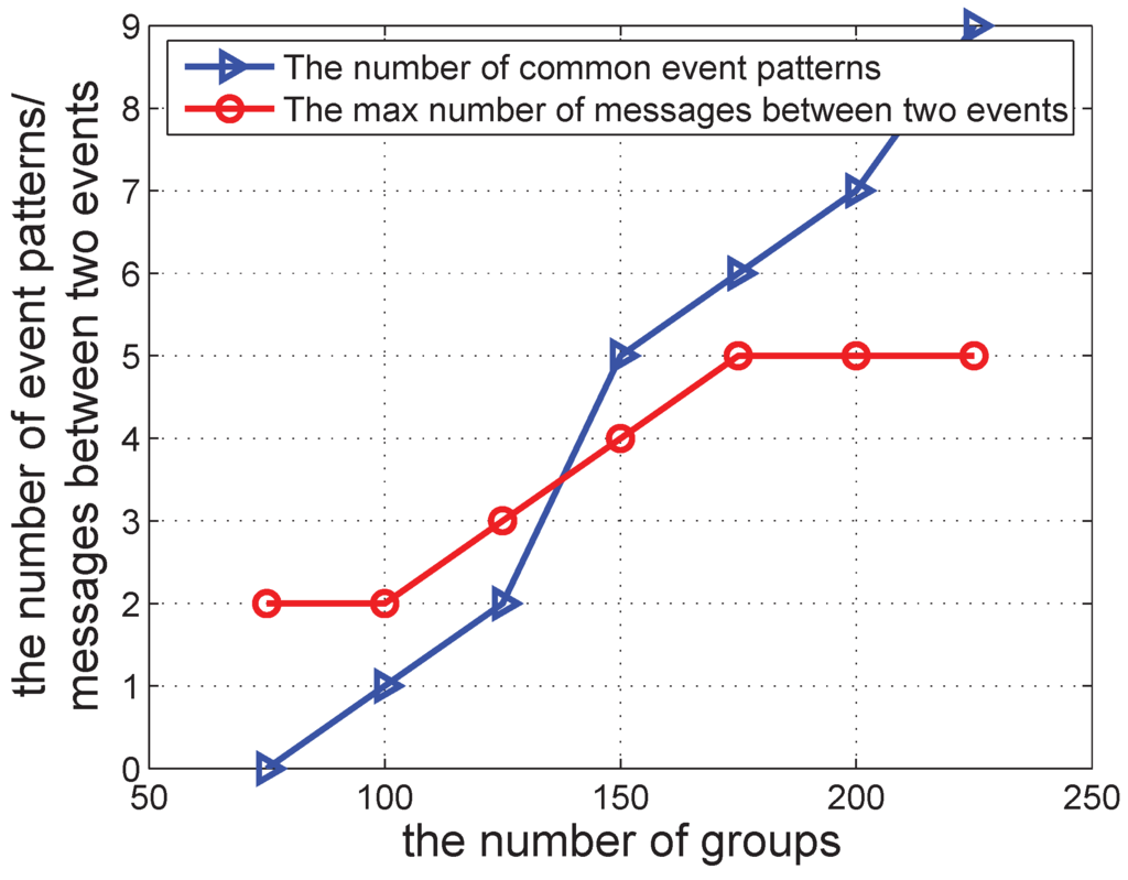 The number of common event patterns/the max number of messages between two events vs. the number of groups.