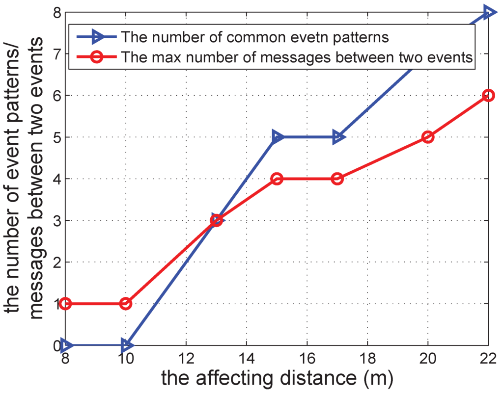 Figure 14 shows the common events and the maximum number of messages between two events when adjusting the affecting distance. The results are similar to those in Figure 13. When the affecting distance increases, the number of common events increases, and the maximum number of messages between two events also increases. This is consistent with the uncertainty of asynchronous communications.
