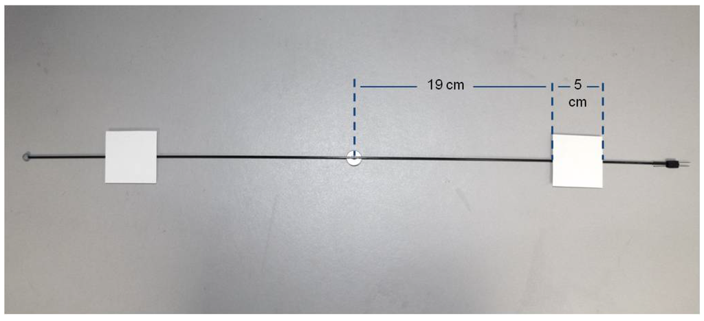 At one end of the arm, a plasticine counterweight (Jovi, S.A., Barcelona, Spain) is placed to compensate for the weight of the insect. At the other end of the arm, there are two parallel, horizontal directed pins for attaching the insect (see Figure 4).