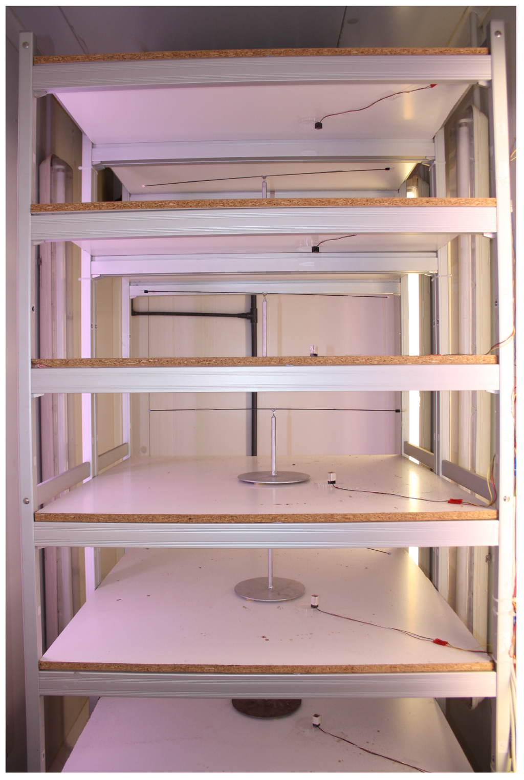 The mill is installed on an open rack, composed of six chipboard shelves (length = 90 cm, width = 90 cm, thickness = 2 cm) with a space of 30 cm between shelves. A total of five mills have been installed in this rack, shown in Figure 8 and Figure 9.