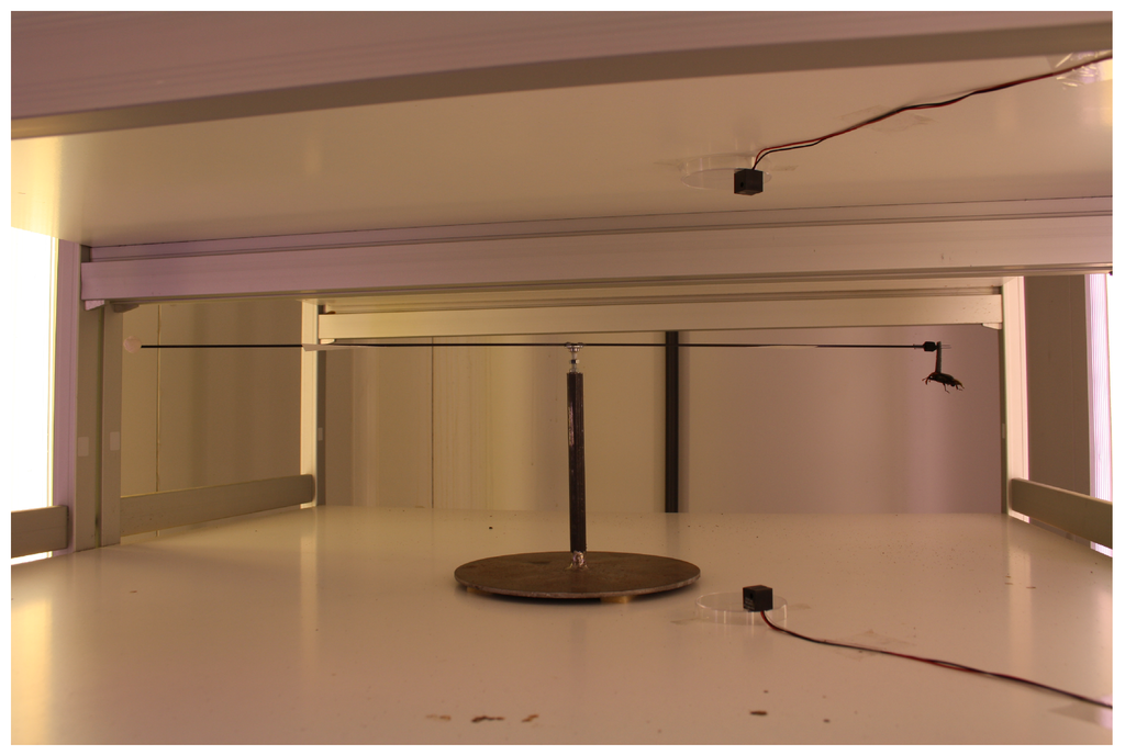The idea of tethering an insect to some structure and studying its flight is not new. In fact, it is several decades old. In 1952, Krogh and Weis-Fogh [16] presented a so-called roundabout for studying sustained flight of swarms of locusts, up to 32, using a stroboscope to measure the speed of the periphery and derive the flight intensity of each individual.