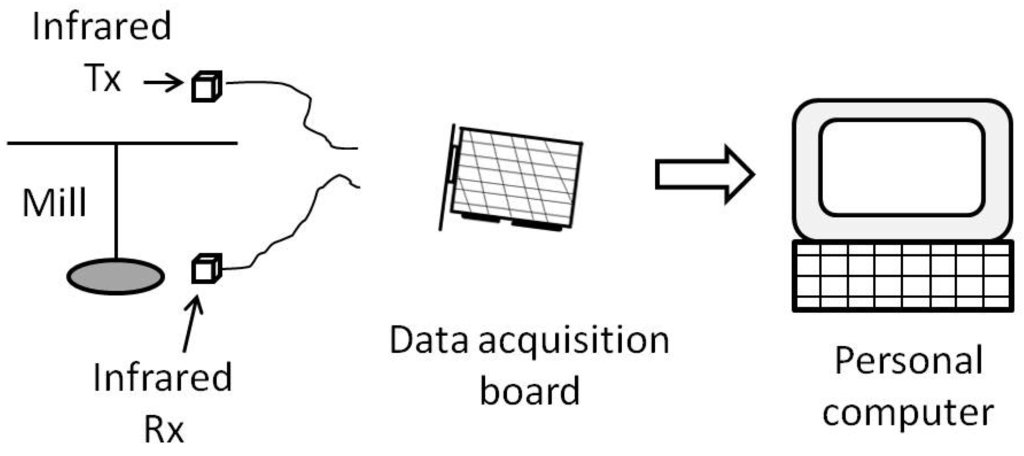 Both the infrared emitter and receiver are connected to a data acquisition board (APCI-IB40; ARCOM CONTROL SYSTEMS, Cambridge, UK). This board allows the connection of up to 40 digital inputs/outputs (DIO), and is also able to power low consumption devices using a 5 volts output and a GND terminal. The power consumption of each emitter and receiver pair is about 10 mA; as the rack allows for the installation of five mills, the total power requirement for the installation is about 50 mA. This is low enough to directly power all five pairs of infrared emitters and receivers from the acquisition board.