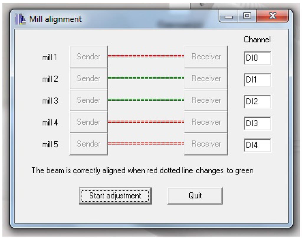 A simple graphical application is used to help the user in the infrared beam alignment procedure. The application configures the APCI-IB40 board to generate an interrupt every 5 ms by means of the timer/counter 0. The interrupt service routine checks the output of the five infrared receivers and shows a coloured label indicating whether the receiver is detecting the beam (green label) or not (red label). A human operator may then adjust the receiver position until the label changes to green, indicating the emitter and receiver are aligned. Figure 12 shows a capture of the graphical interface of this application where only the infrared beams of mills 2 and 3 are correctly aligned.