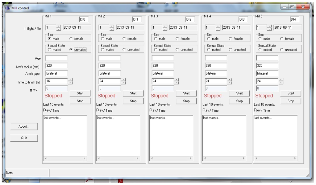 Finally, the software architecture is presented. The data acquisition and processing is carried out by two separate applications. The first one records events in the mill without regard to the attached insect, but considering the mill’s mechanical characteristics, like the arm length and the number of infrared beam interruptions per revolution.