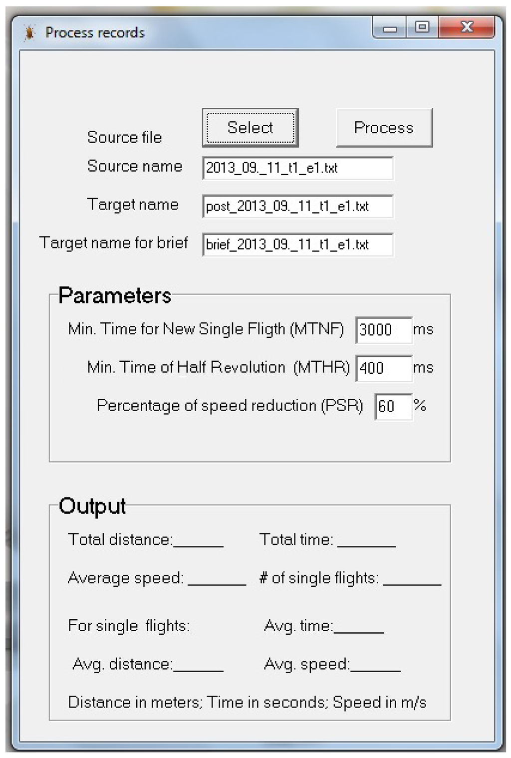 The second application processes the previous raw records, also taking into account insect-related parameters as described in the following sections. This second application provides a list of single flights including flight time and distance, and also a summary of the whole experiment.
