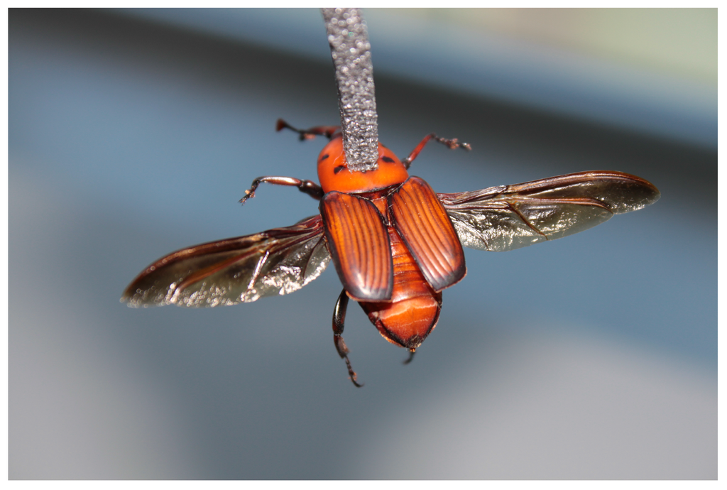 Detail of the tethering of an R. ferrugineus adult to a piece of foam.