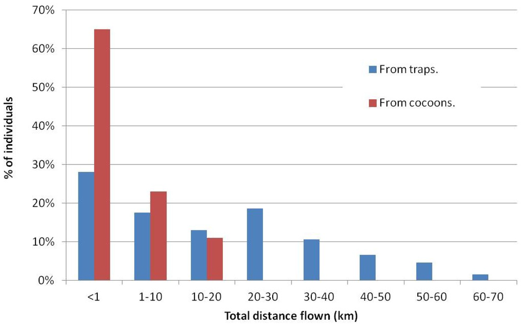 Total distance flown (in km) by individuals coming from traps [15] versus distance flown by individuals coming from cocoons (this work).