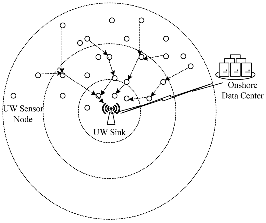 In UASNs, acoustic communication is preferred over radio communication because underwater environment hinders radio waves communication. The unique features of underwater environment do not allow the algorithms used in WSNs to be applied directly in UASNs. An acoustic modem’s energy consumption is quite different from typical radio transceiver [3]. Thus, either novel routing mechanisms or tailored ones are needed for UASNs that take into account the challenges of aquatic environment, and with the objective of network lifetime prolongation. In this regard, many routing protocols are proposed for UASNs [4,5,6,7,8]. Though these works increase the network lifetime, however, not to the extent that is needed.