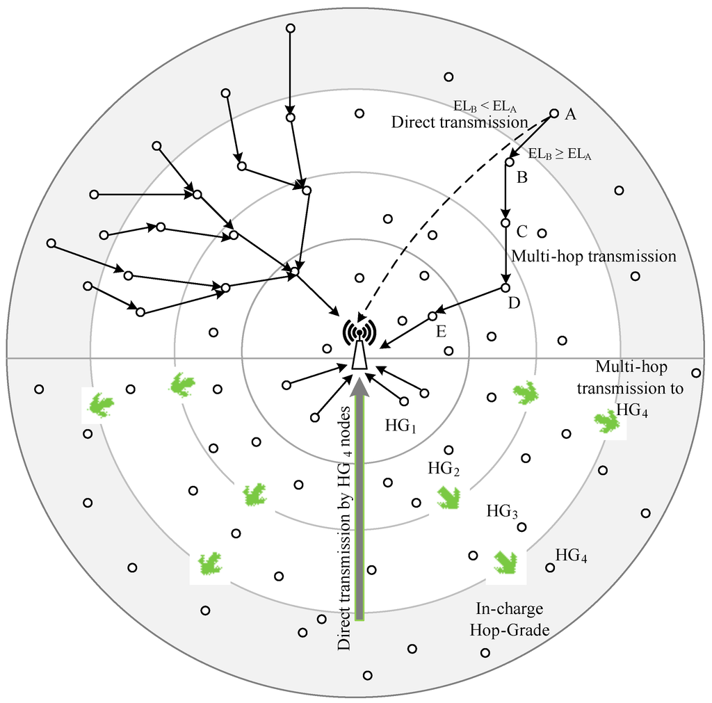 Figure 2 illustrates the data transmission mechanism in BTM and UWDAR. As we can see in the figure, BTM adopts hybrid transmission mechanism and switches between multi-hop and direct transmission mode on the basis of difference in energy levels. While UWDAR assigns in-charge time to each hop-grade periodically according to their traffic characteristics, where, in-charge hop-grade is responsible to collect data from all network nodes and transmit it directly to the sink. This technique works for a limited geographical region due to its backward data transmission constraint.