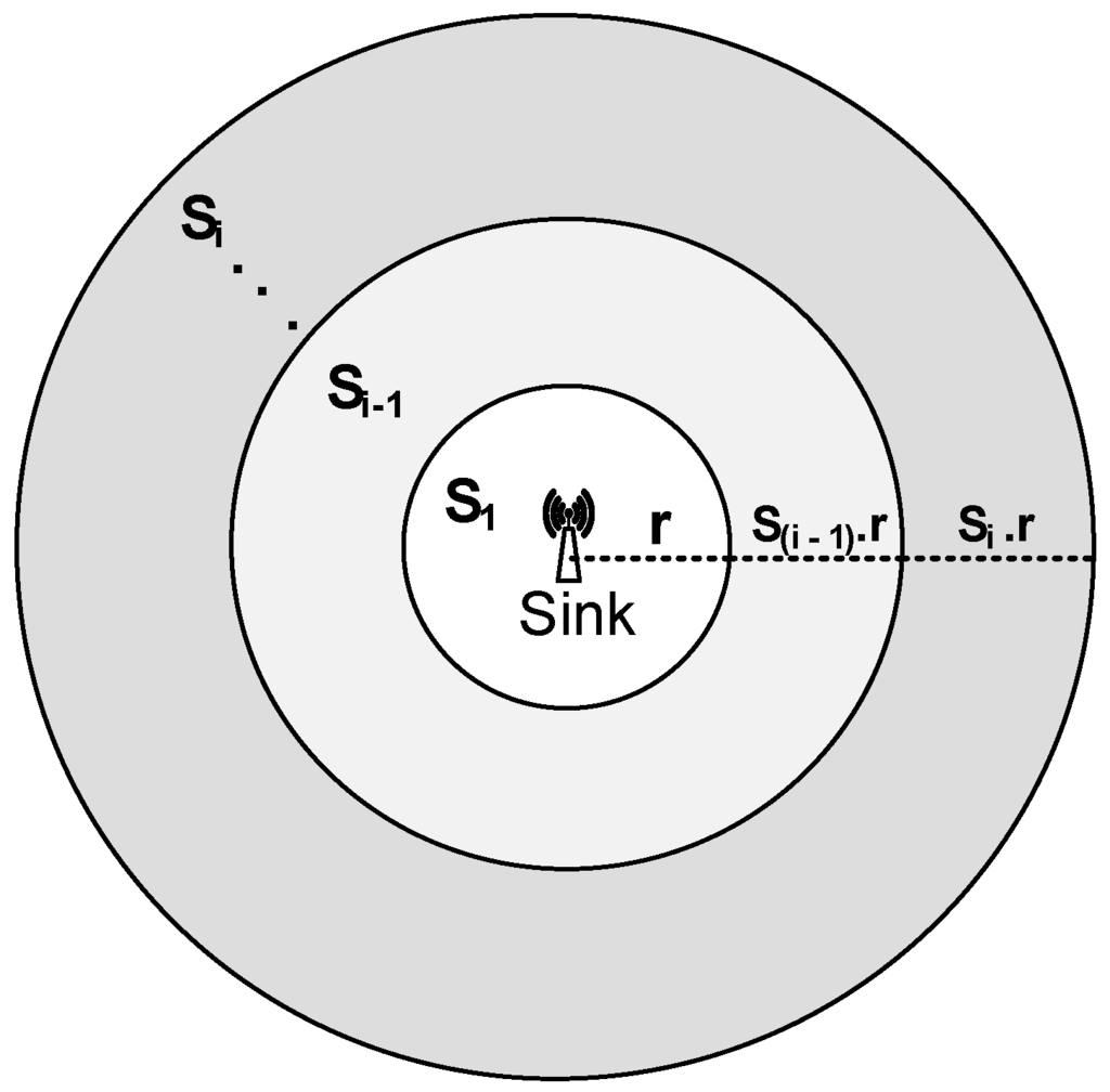 Location awareness (Equations (8) and (10) are used to find the neighbors of a node. Once the neighbors are identified, suitable relays are needed to forward the data from source to destination. In order to select/choose the relays, the network area is divided into regions known as Ring Sectors . The maximum number of ring sectors depends on the network radius R and the optimum transmission distance threshold . Relation between R and can be found from Equations (13) and (16) in [9]. Using these two equations, we find for different R. Using values of , we find . The slice containing sink is denoted by with radius r. Next to is where with radius and , respectively, as shown in Figure 3. The total number of nodes in each Ring Sector is n such that the total number of nodes in the network is N ().