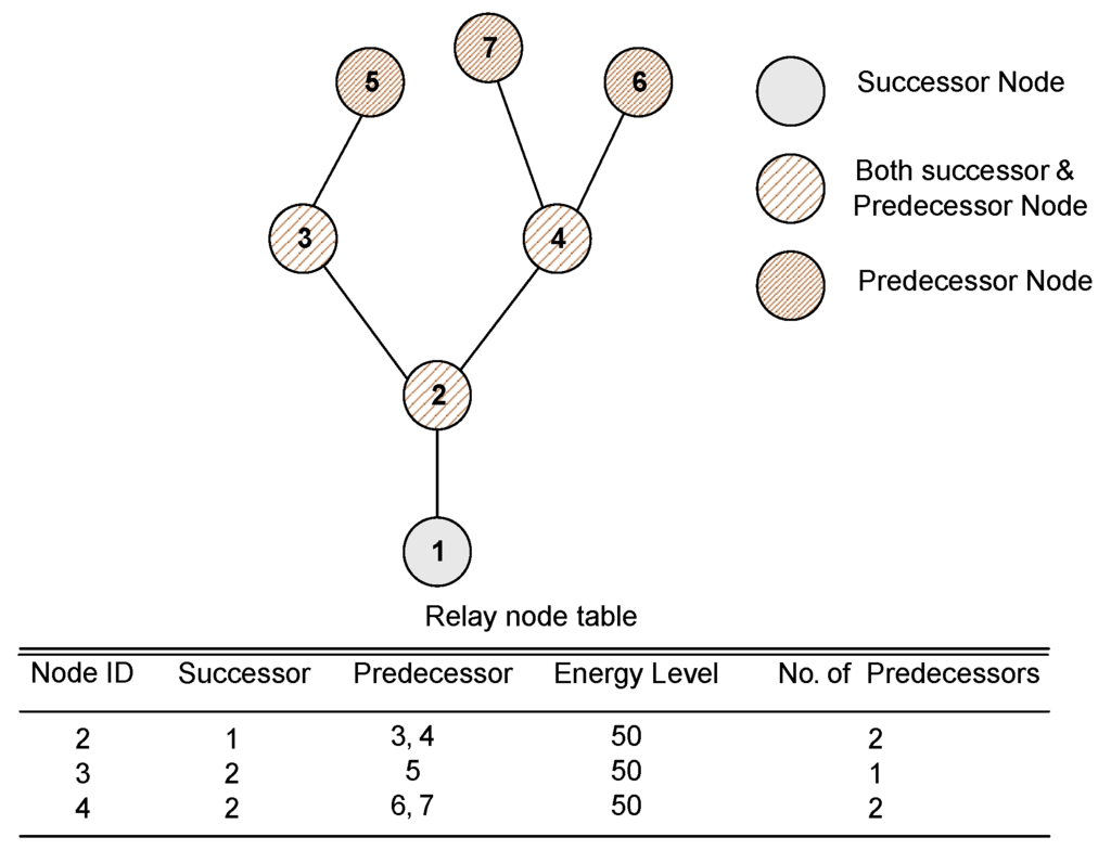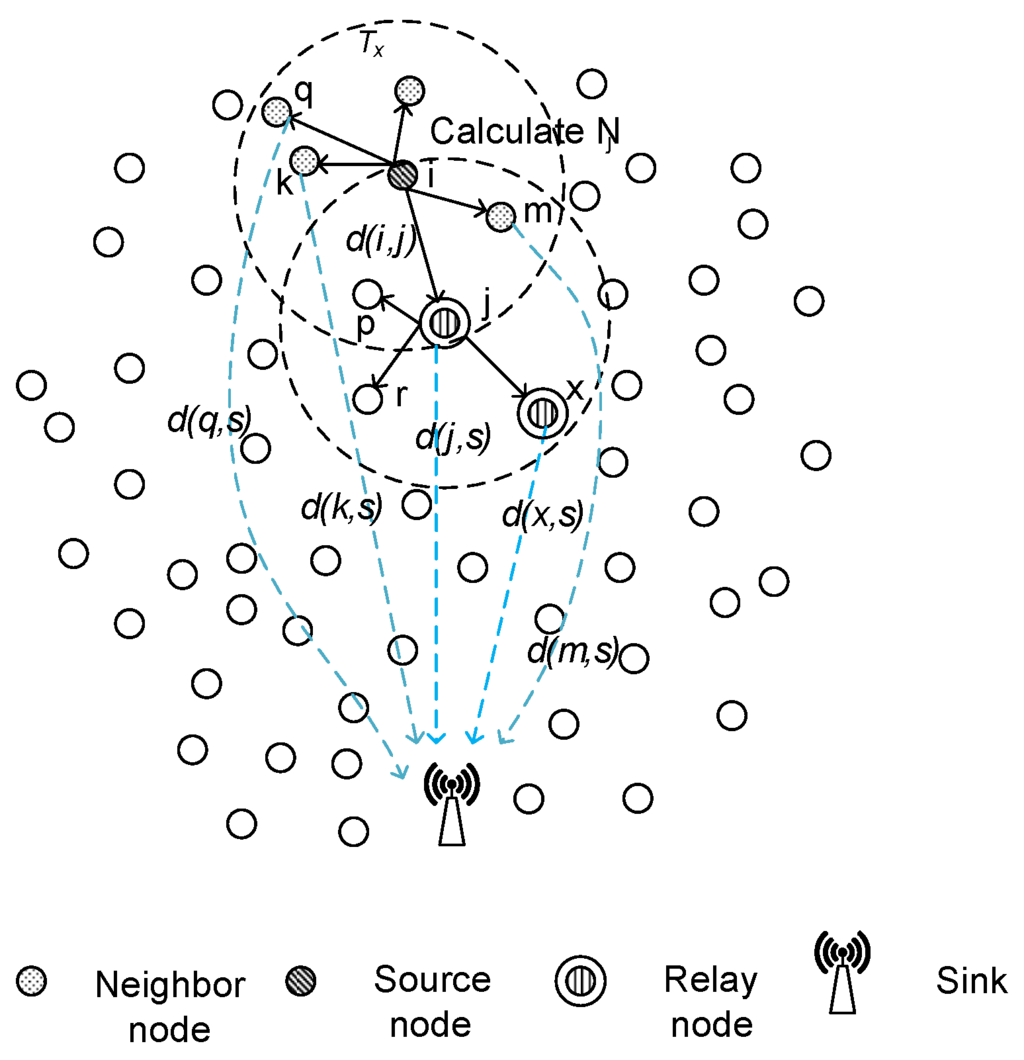 Figure 6 shows the selection of relay node with variations in energy levels. As the nodes send data only to their next-hop node within their optimum transmission range. Here we use = β. We assume . Now we calculate the of sensor node () at time , i.e., (the time when ).