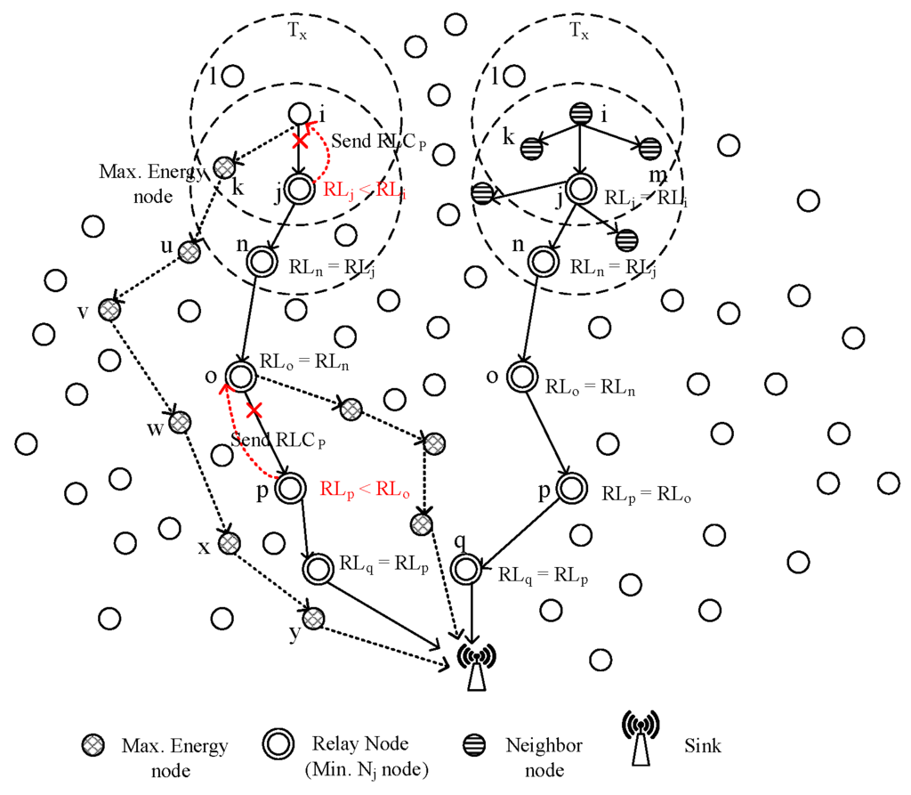 When the data transmission process starts all the network nodes in different Ring Sectors have same Residual RLs, as shown in Equations (11) and (12). Every node transmits data to its next hop neighbor (successor) using multi-hop method; and denote for and for .