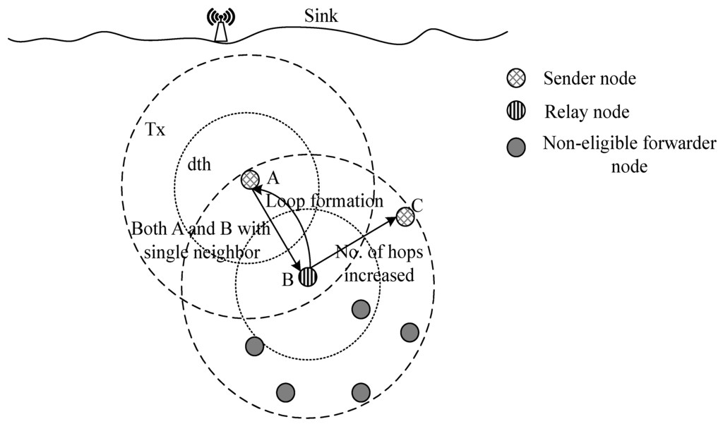 In BTM and EBET, nodes find their relays according to Equation (8). However, if there is a single node in the transmission range of a sender, it selects it as a relay node even if it is at higher depth than the sender. Also, the only receiver node may again select the same sender node as a forwarder which causes transmission loops. In this process, energy is consumed but the data packet cannot arrive at sink. If the high depth receiver node has its neighbor nodes and selects a node for data transmission other than the node from which it has received data packet, the hops are increased in number and energy dissipation occurs. We have proposed a solution for this problem which is discussed as follows.