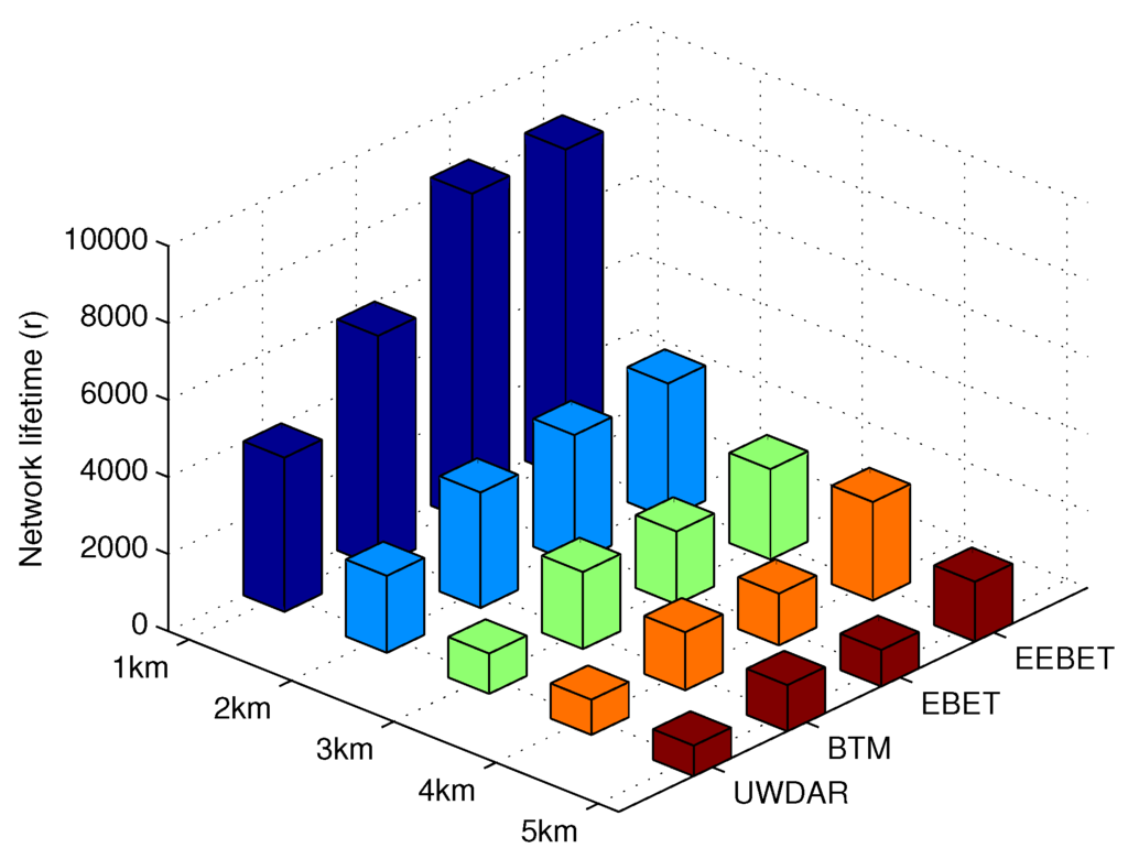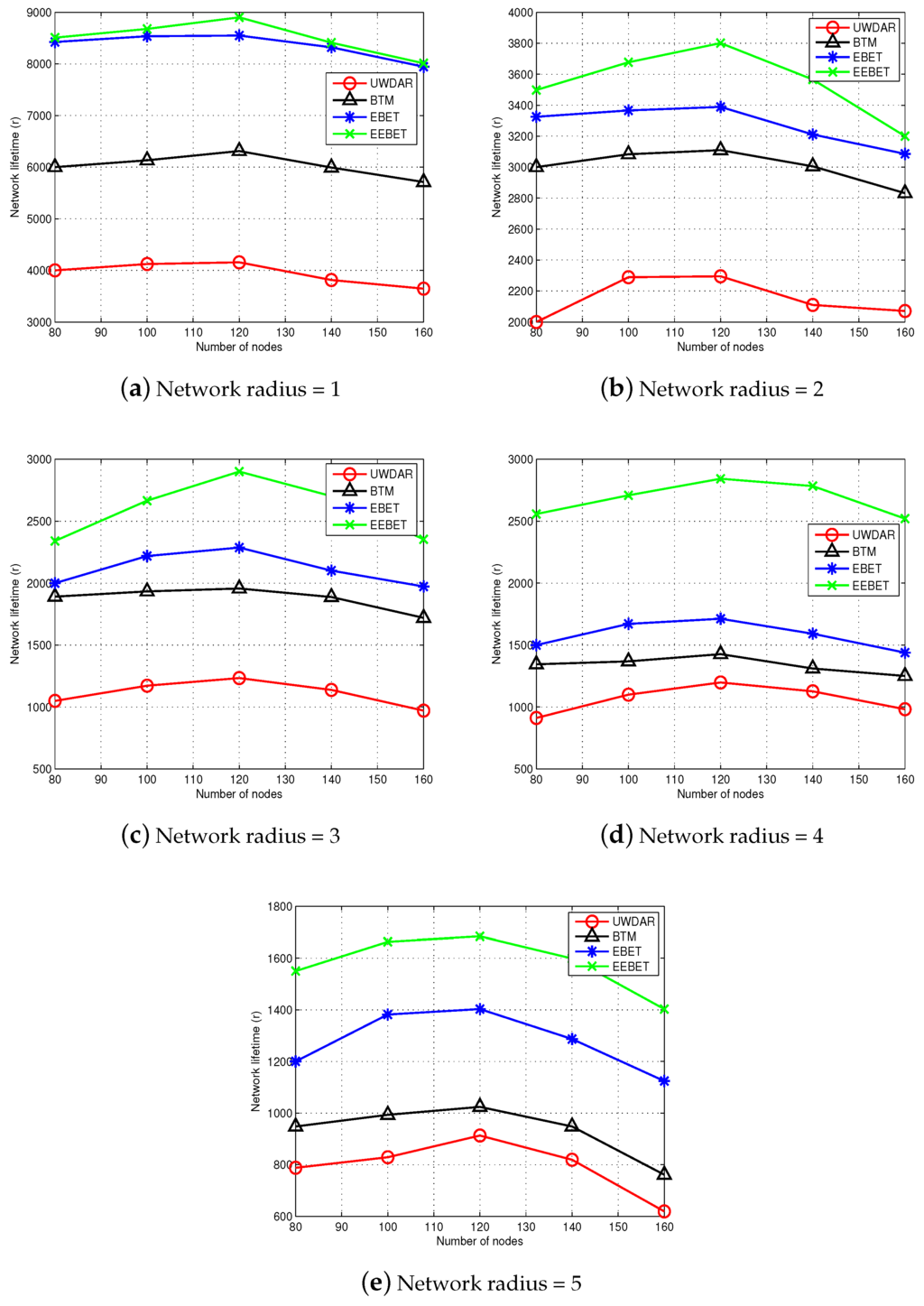 We have simulated EEBET, EBET, BTM and UWDAR with varying number of nodes in the network field of different radii to check the scalability of the existing and the proposed schemes in terms of network lifetime. Figure 11a–e shows the results for network radius ranging from 1 km to 5 km such that the number of nodes vary from 80 to 160. It is evident from the figure that both EEBET and EBET’s lifetime first increases and then decreases when the number of nodes are increased from 80 to 160. Moreover, when the number of nodes exceeds 120, network lifetime of EEBET, EBET and BTM exhibit slight decrease. Also, both EBET and EEBET have longer network lifetime than BTM and UWDAR protocols with increasing number of nodes. All the schemes face decay in network lifetime with increasing number of nodes. This is due to increased congestion and interference when the number of nodes are increased. However, EEBET’s performance is not affected in high proportion, by increasing the number of nodes in network. This is because of the global energy balancing in EEBET which which makes this technique more scalable.