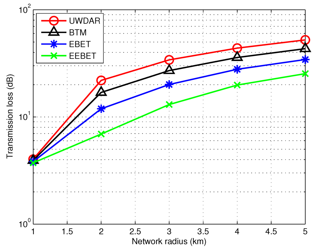 Transmission loss for EEBET, EBET, BTM and the UWDAR techniques is shown in Figure 9. Form this figure, it is clear that the transmission loss of BTM and UWDAR is relatively high as compared to EBET and EEBET. Since transmission loss depends on spreading loss and distance, both BTM and UWDAR schemes use direct transmissions which leads to high path loss. The EBET and the EEBET minimize the communication distance to achieve relatively low transmission loss. This figure also shows the impact of network radius increase on the transmission loss. In this regard, EBET and EEBET exhibit less increase whereas BTM and UWDAR show very high increase. Thus, our proposed techniques are less affected by the network radius as compared to the selected existing ones.
