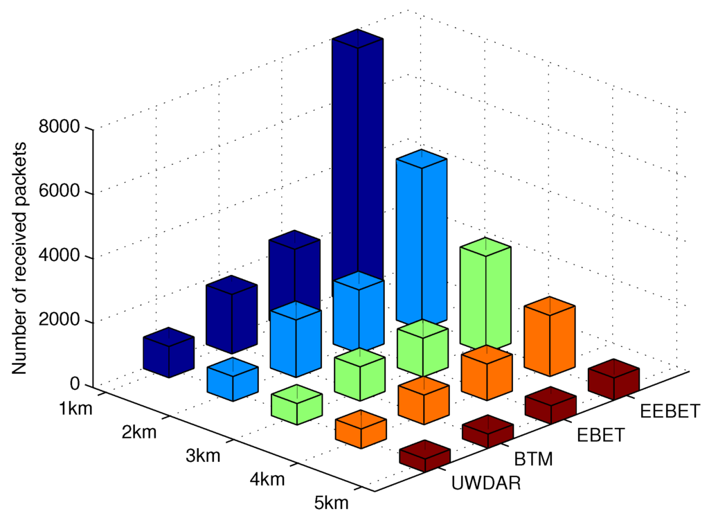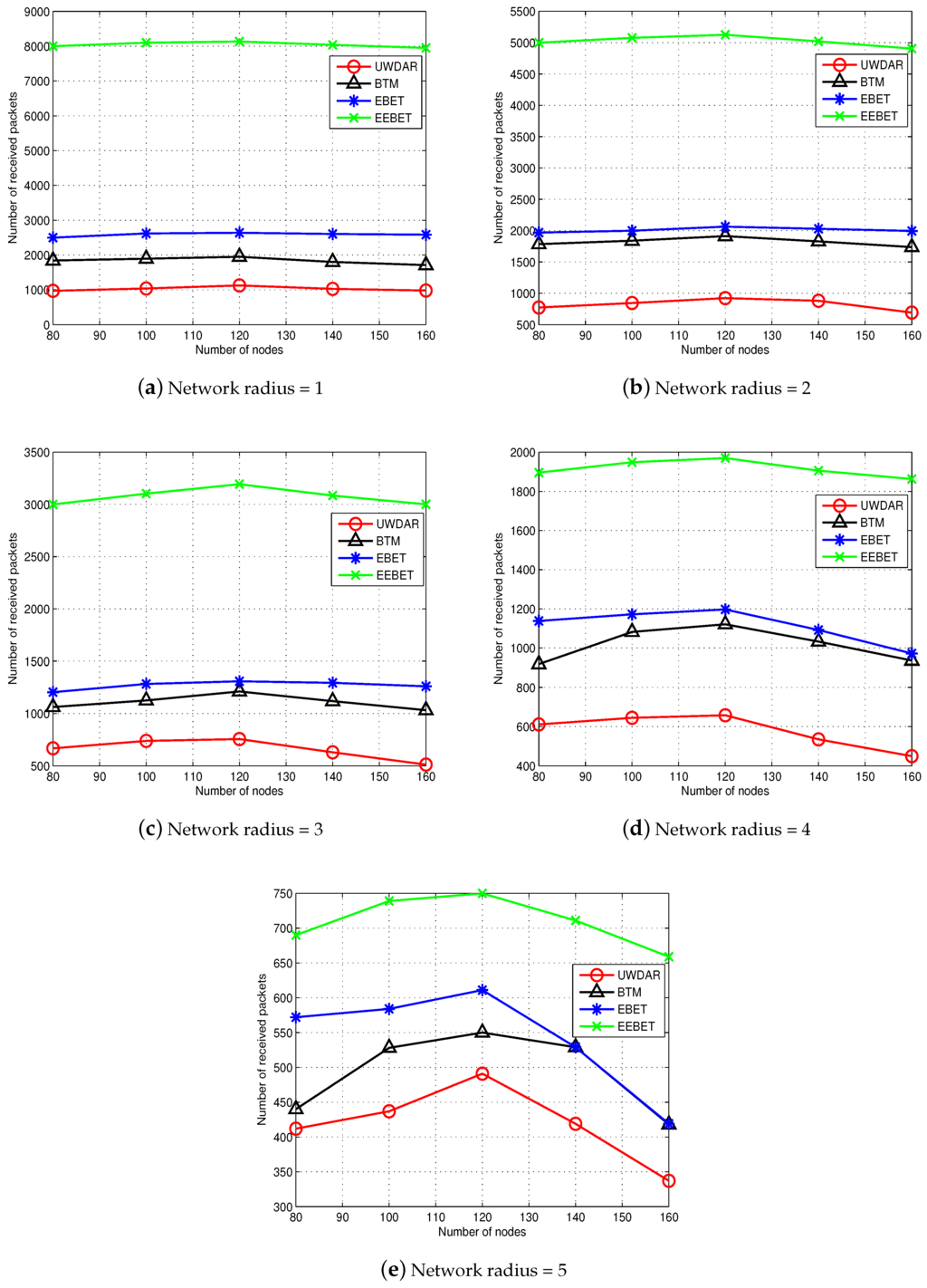 Figure 12a–e shows the number of received packets at sink while implementing UWDAR, BTM, EBET and EEBET, respectively. These results are obtained at different network radii (ranging from 1 km to 5 km) while varying the number of nodes between 80 and 160 for each network radius. In these results, initially, the packet reception rate shows an increasing behaviour and then a decreasing behaviour. The increasing behaviour is due the added number of nodes in the network field as we go from 80 to 100 nodes. From 100 to 160 nodes, the packet reception rate decreases because the added nodes contend for channel to deliver their packets to the sink. This scenario results in increased congestion at the sink which increases the chances of packets’ collision at the sink and high packet collision rate means decreased number successfully received packets at the sink. It is evident from Figure 12a–e that our proposed protocols (EBET and EEBET) show better performance than the existing ones (BTM and UWDAR) due balanced transmission mechanism and linear programming based optimization. The EEBET is more scalable than the rest of the protocols due to global balanced transmissions.