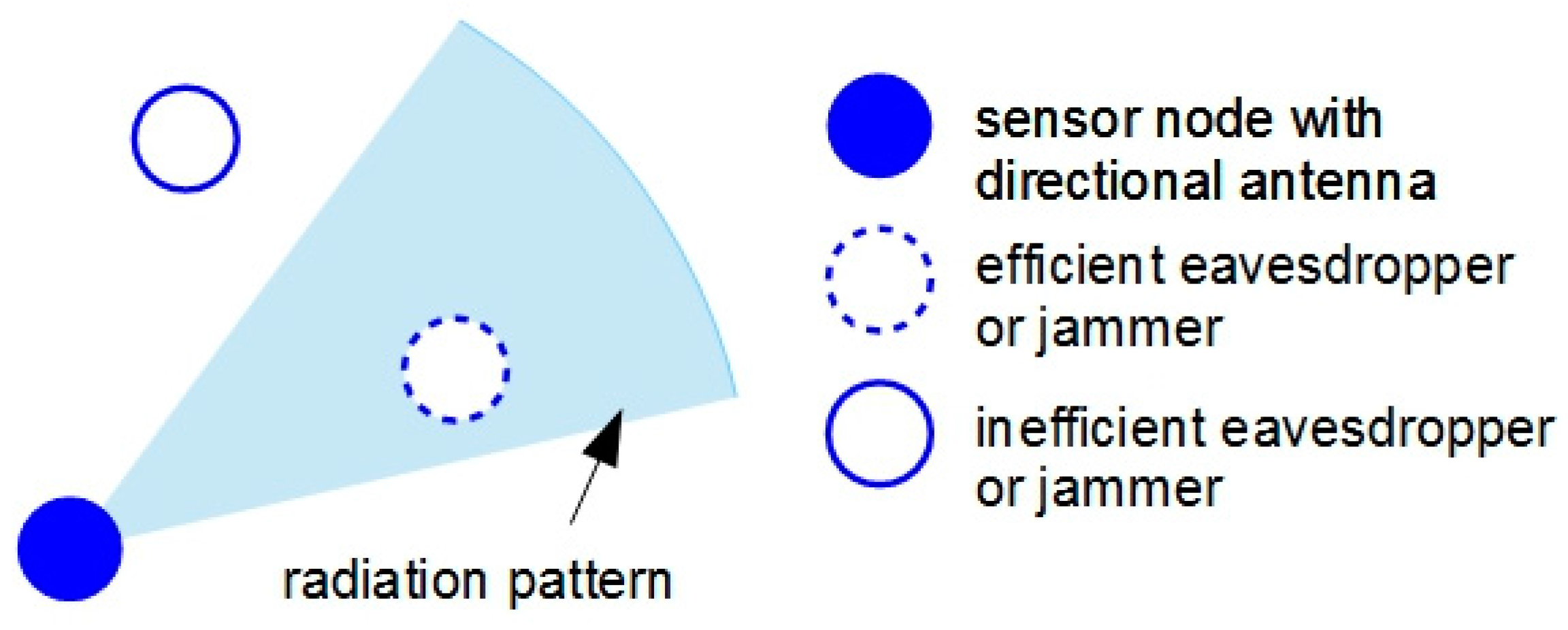 In [41,42], Dai et al. proved that when using directional antennas, the eavesdropping probability is drastically decreased compared to the case of omnidirectional antennas. These studies make three important contributions: (i) they establish eavesdropping models for both omnidirectional and directional antennas in the context of wireless sensor networks; (ii) they prove that in the case of directional antennas the eavesdropping probability is diminished due to two factors: the number of hops to route a message is reduced and the exposure region from where malicious nodes may listen is smaller; and (iii) they validate the two eavesdropping models (in omnidirectional and directional case) and the corresponding values of eavesdropping probability through extensive simulation studies.