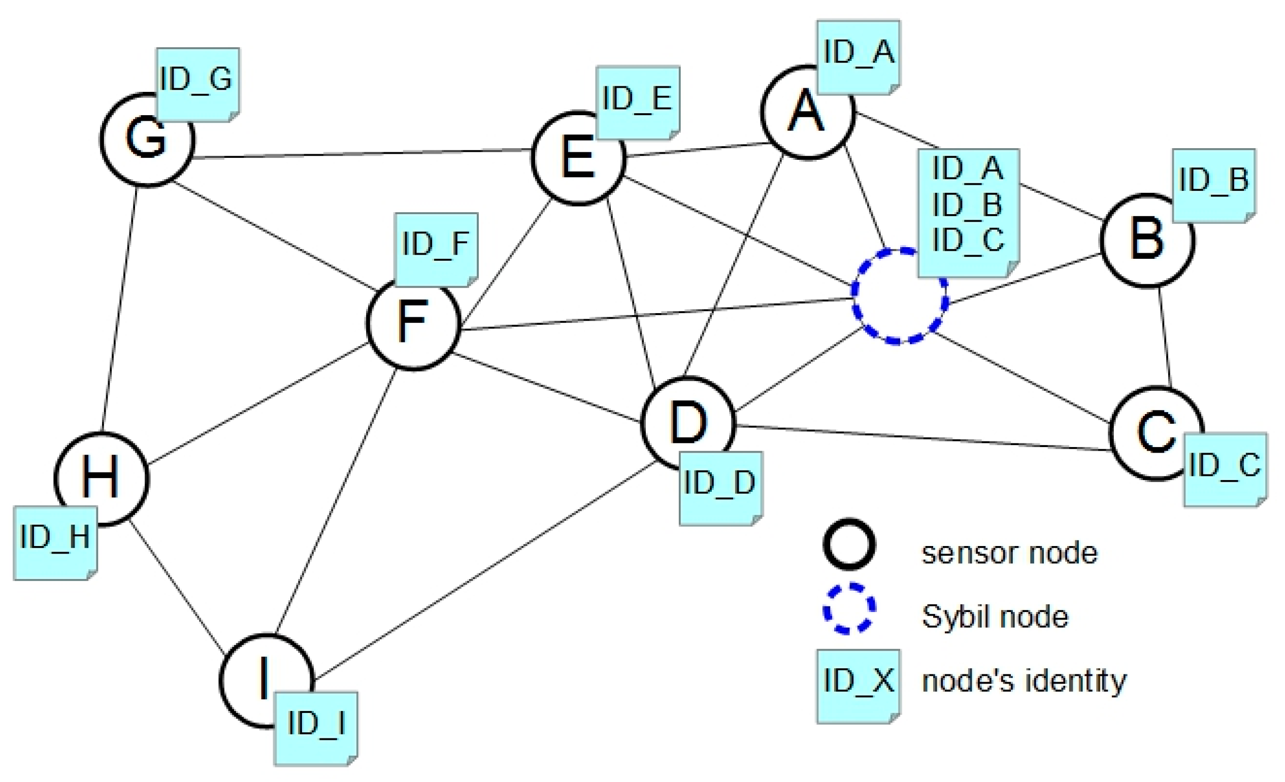 Usually, in a wireless sensor network each node has its own identity (ID), a one-to-one relationship between nodes and their unique IDs being a prerequisite for many network mechanisms [59]. In a Sybil attack [60], a malicious node forges the identities of authenticated network nodes and, as a consequence, can spread its aggressive activities to other nodes or even throughout the entire network.