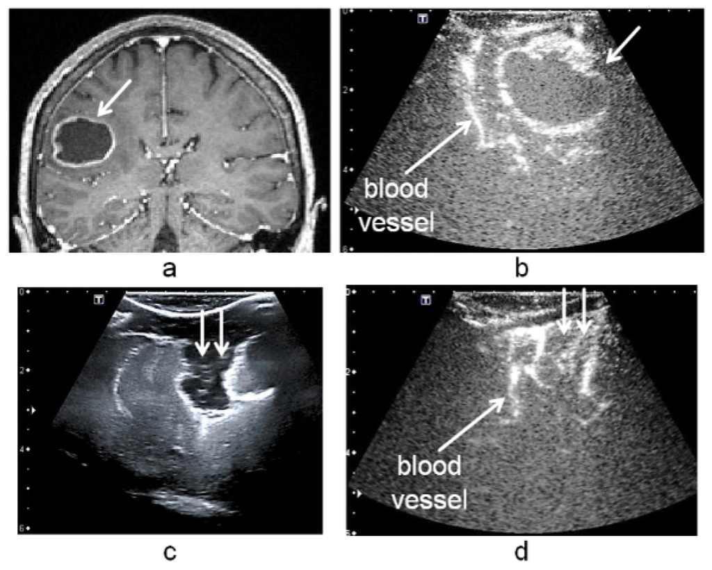 Patient image data acquired during tumor resection. The brain tumor (white arrow) is represented in the preoperative cT1MR data (a) and in the 3D-iCEUS (b) acquired at the beginning of the operation. After tumor removing, the resection cavity (indicated by two white arrows in (c) and (d) is well visible in the B-mode ultrasound image (c). In the 3D-iCEUS acquired at the end of the operation (d); the borders of the cavity can be easily interpreted as a blood vessel.