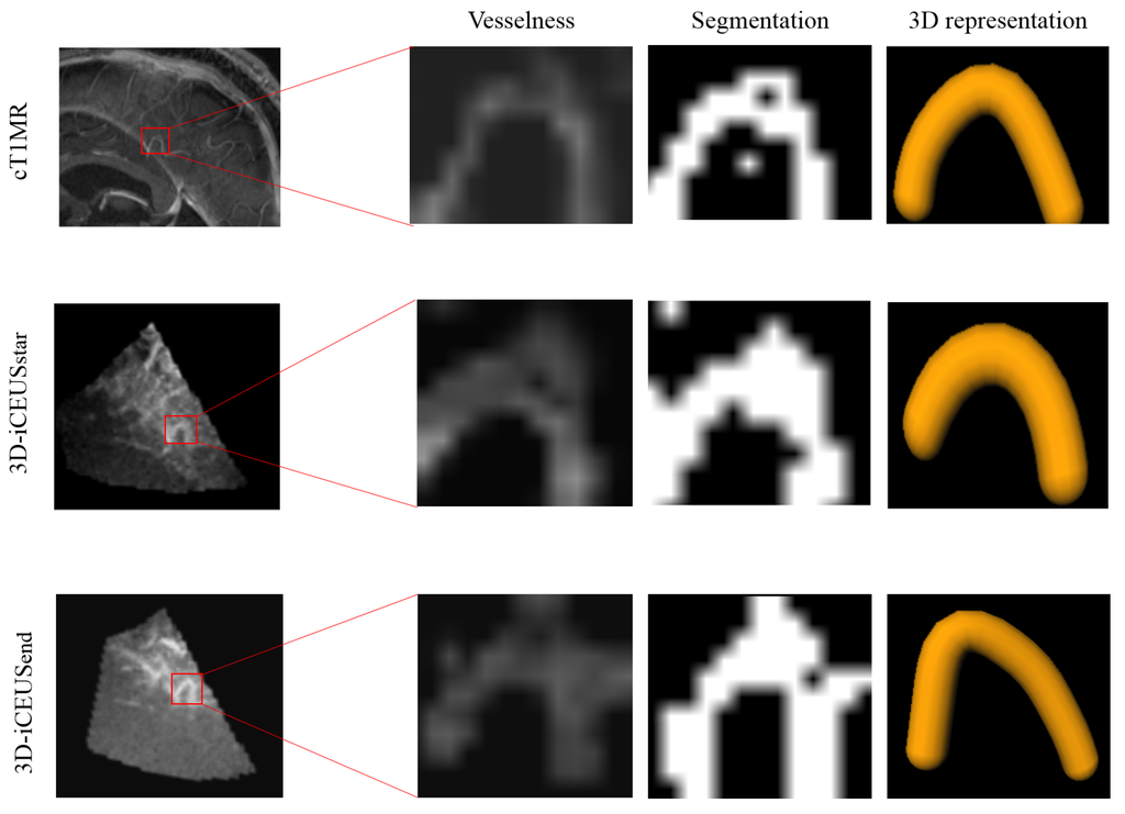 Finally the obtained image of vesselness responses is thresholded using the Otsu method [27] in order to extract the vascular structures. Figure 2 presents an illustration of blood vessel segmentation process from cT1MR, 3D-iCEUS and 3D-iCEUS. An additional step of 3D representation is added here.