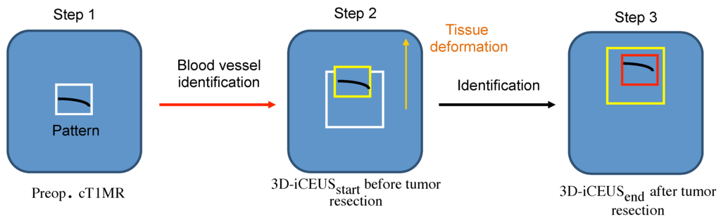 - Step 2: Blood vessel identification in 3D-iCEUSThe pattern is firstly searched in the 3D-iCEUS data acquired before resection. In order to reduce the computing time, the search space (large white frame, Step 2, Figure 3) is smaller than the entire 3D-iCEUS, but large enough to take the tissue deformations into account. It has twice the volume of the region of interest defined in the cT1MR data, and is centered on the same image position. The enhanced structures in this region are segmented and then a rigid registration method is used to find the sample in the 3D-iCEUS data (yellow frame, Step 2, Figure 3) which corresponds best to the pattern. A rigid transformation is sufficient here, since the goal is the identification of the position of the blood vessel in the 3D-iCEUS data, which looks like the vascular segment pattern selected in the cT1MR data. The blood vessel detected in the 3D-iCEUS then becomes the new pattern, which has to be identified in the 3D-iCEUS data after resection.