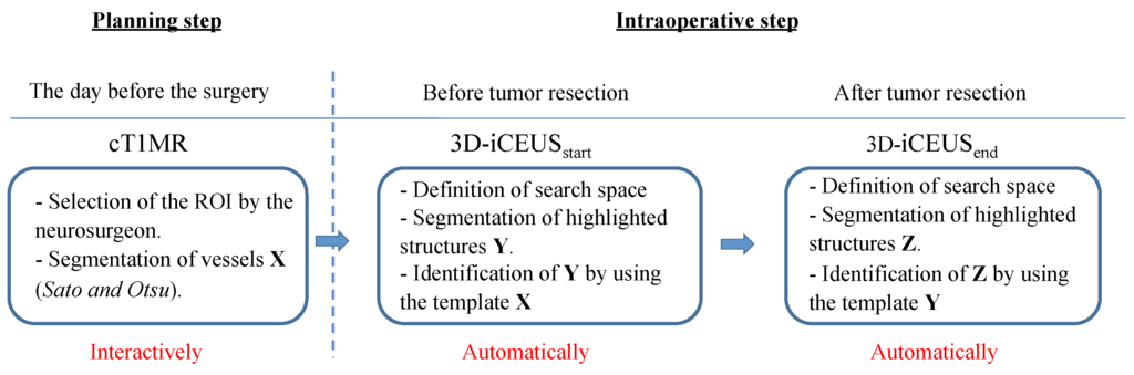 The proposed method consists in identifying the vascular structures in the image data involved in the patient treatment. During the planning stage, some vascular structures close to the tumor are selected by the neurosurgeon. These patterns are automatically recognized in the 3D-iCEUS data by using image registration techniques. The identification method of vascular structures is depicted in Figure 3 and is described as follows: