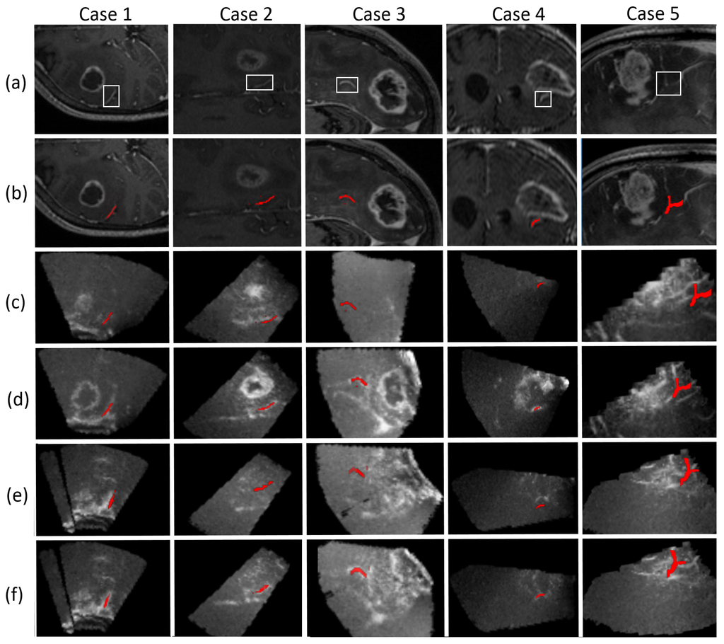 In Figure 5, the results obtained step by step for five cases are illustrated. First, the ROI is defined in the cT1MR by the surgeon (column (a)) in the planning stage and it encloses the selected vascular structure so as to reduce the space of segmentation. Second, the vessel is extracted by using the process described in Section 2.2 (column (b)). Third, the vascular structure extracted from the cT1MR data is overlaid on the 3D-iCEUS (column (c)). It should be observed that the extracted structure is not spatially aligned with its corresponding in the 3D-iCEUS. Fourth, after the segmentation of the vascular structure in 3D-iCEUS, column (d) presents the registration results, in which, vascular structures are aligned. At this step, the blood vessel found in 3D-iCEUS becomes the new pattern and it is superimposed on the 3D-iCEUS image in column (e). In most of cases, there is no matching between the new pattern with its corresponding vessel in the 3D-iCEUS because of large tissue deformations at this stage of the operation. Finally, the registration of vascular structures from the 3D-iCEUS to 3D-iCEUS is carried out (column (f)).
