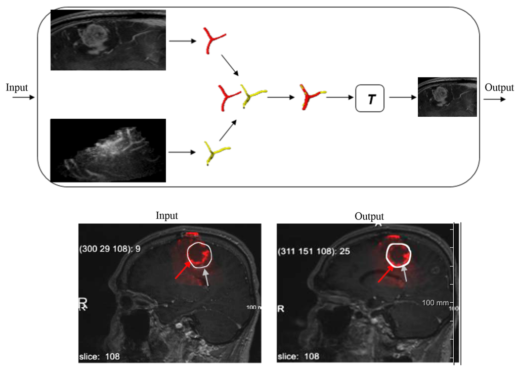 An illustration of using vascular structures from cT1MR and 3D-iCEUS for correcting the brain shift is depicted in Figure 6. First, the blood vessels are extracted from the both modalities and by overlapping them it is clearly observed that they are not aligned. Second, a registration process is performed to align the segmented structures. By registering the targets, a matrix denoted T which describes the spatial transformation necessary for aligning structures is obtained. Then, this transformation matrix is applied on the cT1MR images so as to achieve its matching with the 3D-iCEUS data. Finally, the superimposing of these image modalities is presented for the input before registration and for the output after registration.