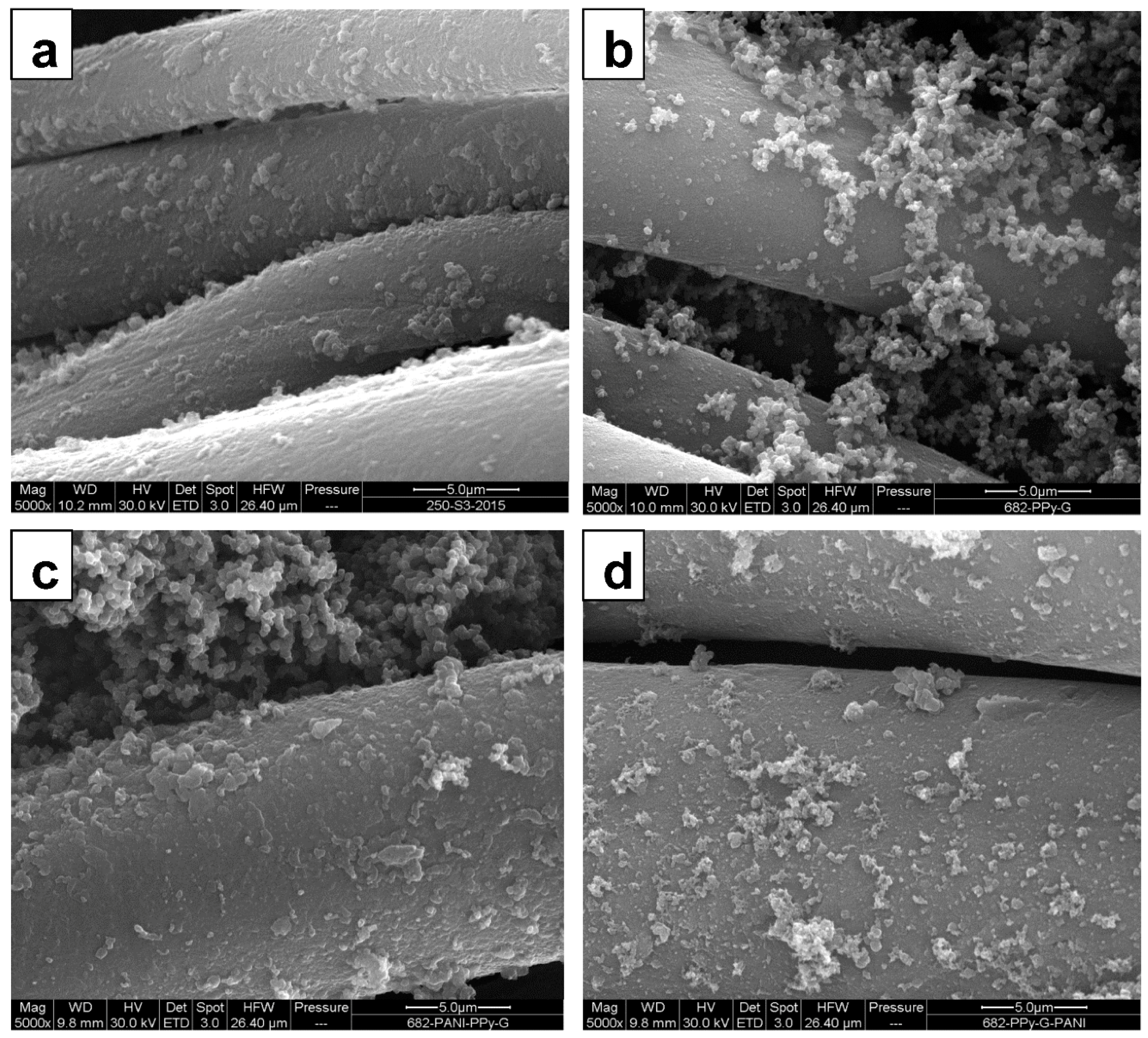 - Yaghoubidoust, F.; Wicaksono, D.H.B.; Chandren, S.; Nur, H. Effect of graphene oxide on the structural and electrochemical behavior of polypyrrole deposited on cotton fabric. J. Mol. Struct. 2014, 1075, 486–493. [Google Scholar] [CrossRef]