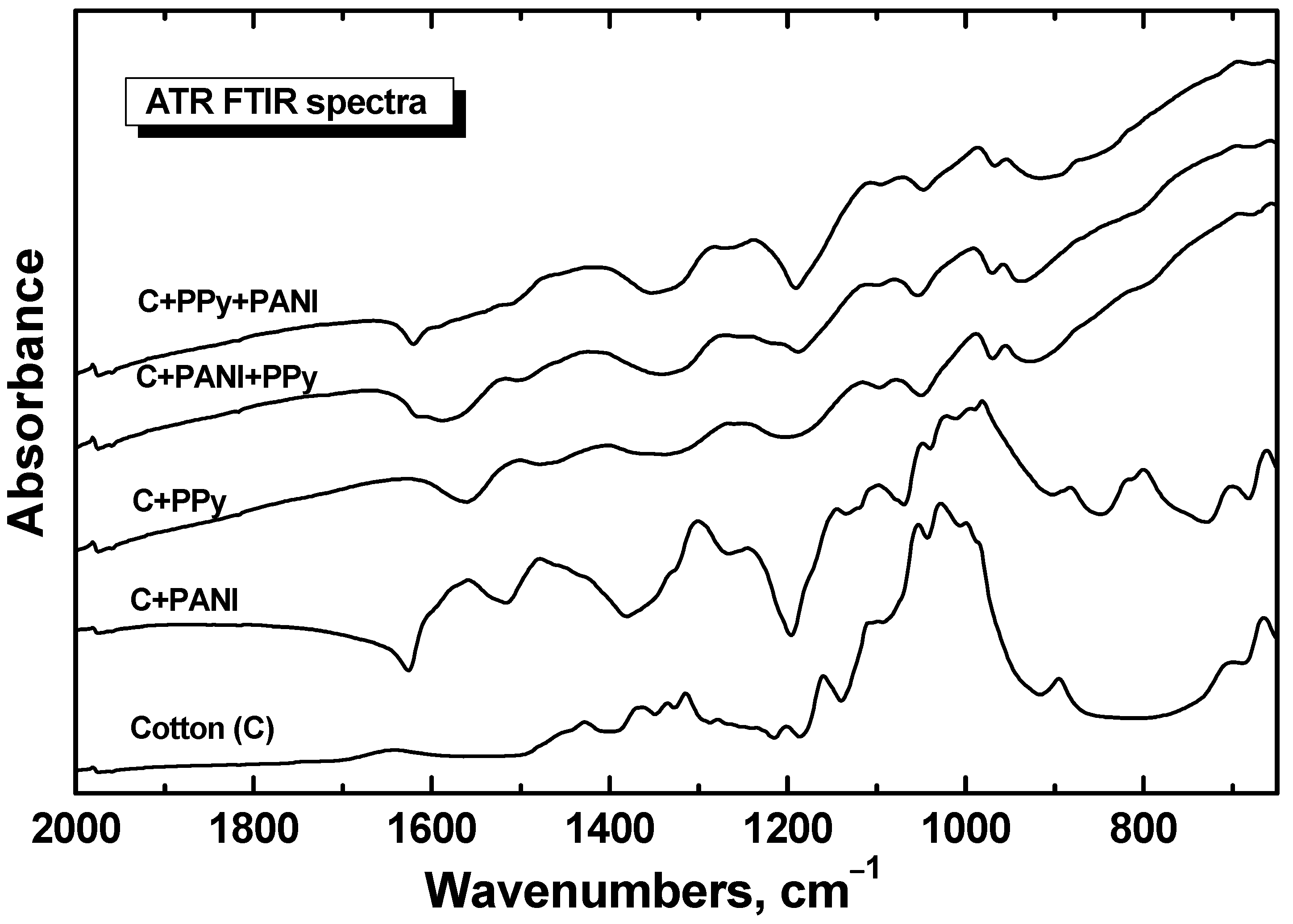 - Bober, P.; Stejskal, J.; Šeděnková, I.; Trchová, M.; Martinková, L.; Marek, J. The deposition of globular polypyrrole and polypyrrole nanotubes on cotton fabric. Appl. Surf. Sci. 2015, 156, 737–741. [Google Scholar] [CrossRef]